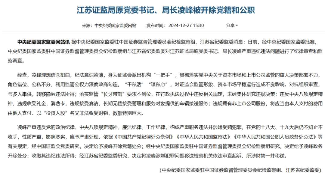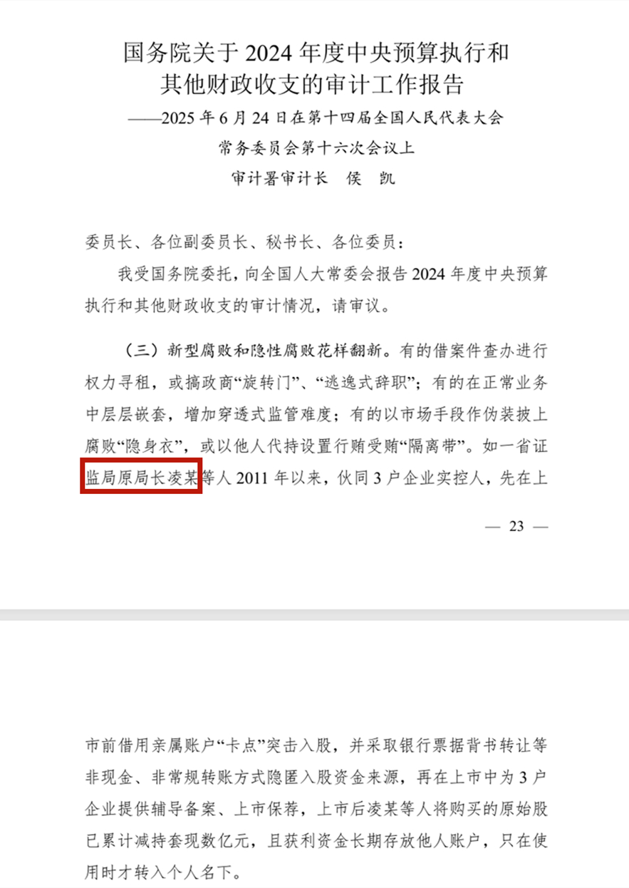 2025 年 6 月 24 日,审计署发布的《国务院关于 2024 年度中央预算执行和其他财政收支的审计工作报告》中,一起金融监管系统内部人员的腐败案件引发资本市场震动。报告披露的 “一省证监局原局长凌某等人借用亲属账户‘卡点’突击入股,累计减持套现数亿元” 的细节,将江苏证监局原党委书记、局长凌峰的隐秘贪腐路径推向公众视野。这场持续十余年的资本暗战,不仅暴露出监管者与资本勾连的复杂生态,更折射出金融监管体系中权力寻租的深层漏洞。